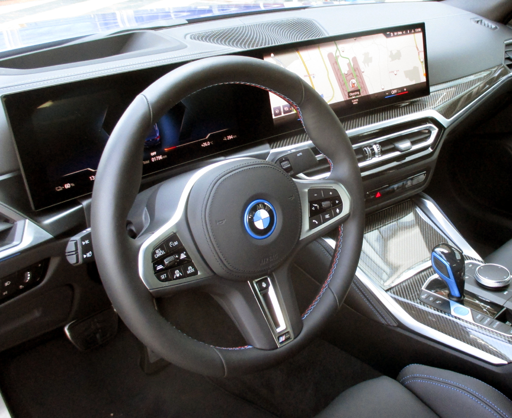 Das Fahren: Wir sind im stärkeren i4 M50 unterwegs gewesen, dessen Bordcomputer bei uns nach normalen Orts-, Landstraßen- und spritzigeren Autobahnfahrprofilen bei dennoch eher moderater und möglichst konstanter Fahrweise ohne häufigere Lastwechsel am Ende in Sachen Verbrauch 23,9 Kilowattstunden angezeigt hat. Beim tiefergelegten M-i4 mit M-Adaptivfahrwerk, variabler Sportlenkung, M-Sportbremsanlage und optional bis zu 20 Zoll großen M-Leichtmetallrädern gehen die Elektromotoren dank Sportboost überaus kraftvoll zu Werke. Vorn ist eine Doppelgelenk-Federbein-, hinten eine Fünflenkerachse verbaut. Hubabhängige Stoßdämpfer und Hinterachsluftfederung sind Serie. Der mit spezieller Radschlupfbegrenzung kombinierte elektrische Allrad gewährleistet selbst bei dynamischeren Fahrmanövern noch hohe Stabilität beim Fahren. Die drei unterschiedlichen Fahrmodi Komfort, Eco Pro und Sport sind einstellbar. Der Komfort liegt auf Limousinen-Niveau. Ein modellspezifischer Antriebssound gibt Rückmeldung auf Lastanforderung und Geschwindigkeit. Beim i4 M50 hört sich der besonders energiegeladen an. Eine Kooperation mit Filmmusik-Komponist und Oscar-Preisträger Hans Zimmer („König der Löwen“) hat laut dem Hersteller die neuen Klangvarianten erlaubt.