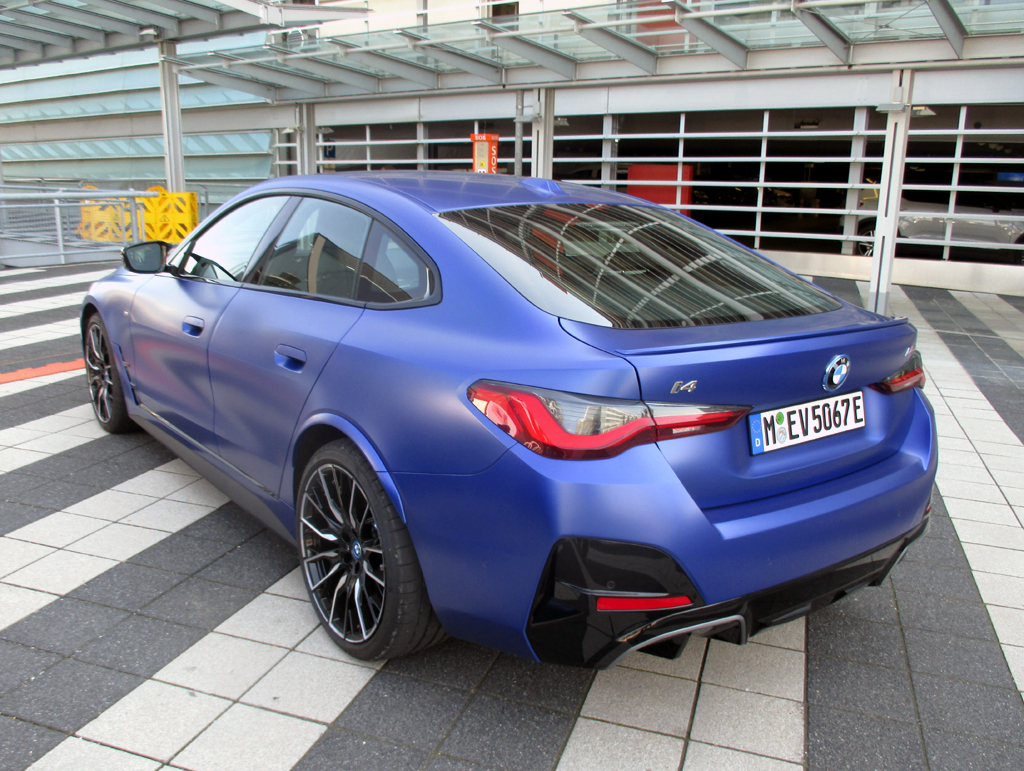 Die Ausstattung: Die Liste ausgewählte Serienausstattungen reicht beim i4 eDrive 40 etwa von LED-Scheinwerfern über Schwellerverkleidung mit integrierten Airbreather, Live Cockpit Plus, Klimaautomatik, Multimedia, Navigation, (Lade-)Vernetzung, Sportsitzen, Sportlederlenkrad, Aufmerksamkeits-, Spurverlassens-, Frontkollisionswarnung, Tempomat mit Bremsfunktion, Parkassistenz mit Rückfahrkamera, elektrische Heckklappe, mobiles Heimladegerät für Haushaltssteckdosen und Mode-3-Kabel für schnelles Laden an öffentlichen Stationen bis hin zu 17-Zoll-Leichtmetallrädern mit 225er-Reifen. Insgesamt sollen rund 40 Fahrerassistenzfunktionen verfügbar sein. Beim i4 M50 sind unter anderem zusätzliche Designumfänge, darunter äußere Lufteinlässe im Stoßfänger vorn und Designakzente auf der Diffusorblende am Stoßfänger hinten, sowie Alcantara-/Sensatec-Kombination und 18-Zöller mit 245/255er-Reifen Standard. Als einziges weiteres Modell ist der ab 62 200 Euro teure i4 eDrive 40 M-Sport zu haben.