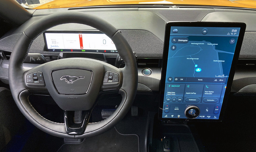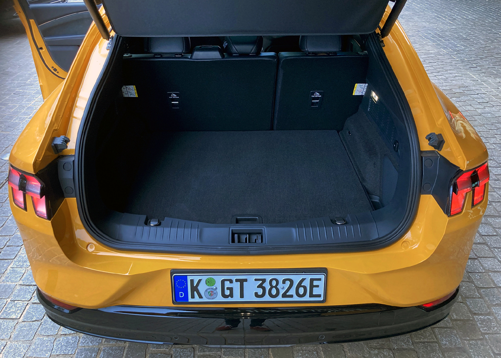 Das Fahren: Das Fahrerlebnis überzeugt. Der Motor hinten erreicht Ford zufolge schon nach einer halben Sekunde seine maximale Antriebskraft, der vorn steuert zusätzliche Leistung, Drehmoment und Traktion bei. Die Beschleunigung ist schon beeindruckend. Die drei Fahrprogramme „Zahm“, „Aktiv“ und „Temperamentvoll“ sind bereits in den normalen Mach-E Standard, passen die Kennlinien von Fahrpedal, Lenkung, Dämpfung, simulierten Schaltvorgängen und künstlich erzeugtem „Motorsound“ im Innenraum entsprechend an. Als zusätzlicher Modus kommt im GT noch „Ungezähmt“ hinzu. Er verringert die Schwelle zur Aktivierung des elektronischen Schleuderschutzes und der Traktionsregelung, um sich etwa auf Rennstrecken noch ambitionierter fortbewegen zu können. Zudem ist der Antriebsstrang speziell kalibriert. Der größere Teil des Motormoments geht an die Hinterräder, was den sportlicheren Fahrcharakter nochmals erhöht. Das Fahrwerk arbeitet adaptiv auf Basis der elektronischen Dämpferverstellung. Über das serienmäßige One Pedal Drive lassen sich das Beschleunigen und Bremsen in einem Pedal vereinen. Es bietet die Möglichkeit, die Reichweite zu vergrößern. Statt das Bremspedal zu betätigen, genügt es dank Rekuperationsverzögerung, einfach den Fuß vom Fahrpedal zu nehmen – und die zurückgewonnene Energie wird als Strom wieder in die Batterie eingespeist. Die bei Elektroautos sonst nicht selten etwas künstlich wirkende Lenkung gibt in diesem Fall direktere Rückmeldung. Die Scheibenbremsen packen standfest zu.
