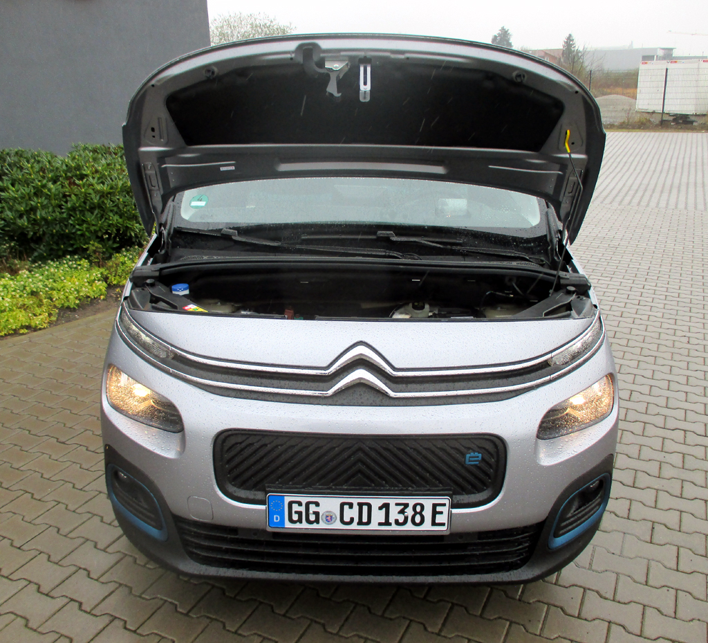 Der Berlingo ist ein kompakter Hochdachkombi, hier mit geöffneter Haube vorn.