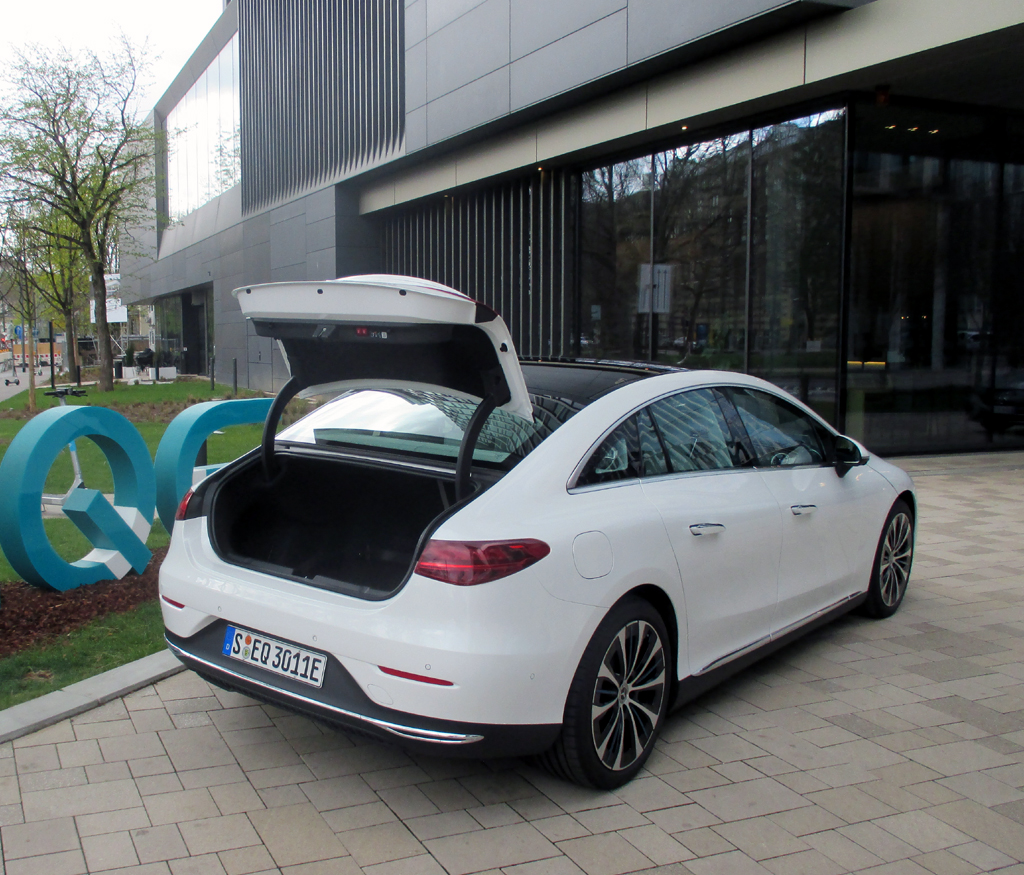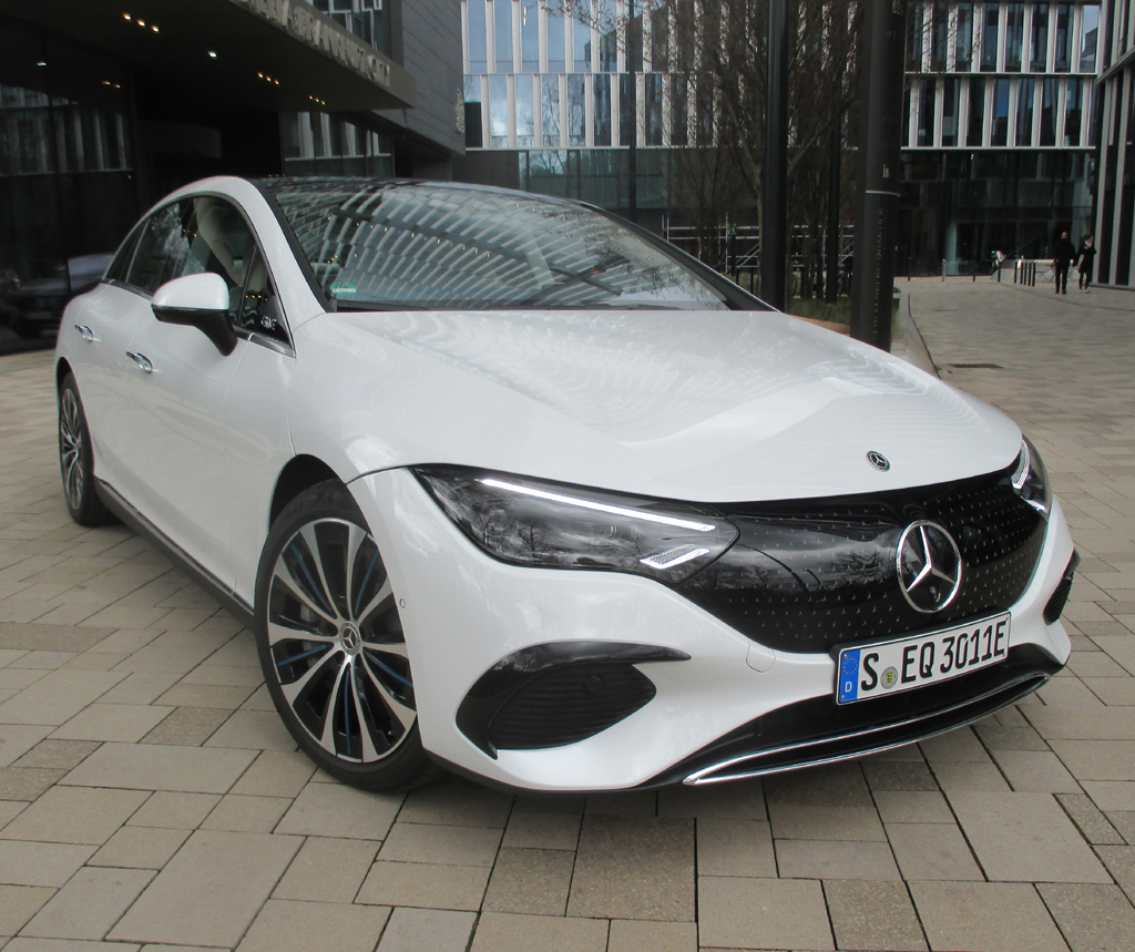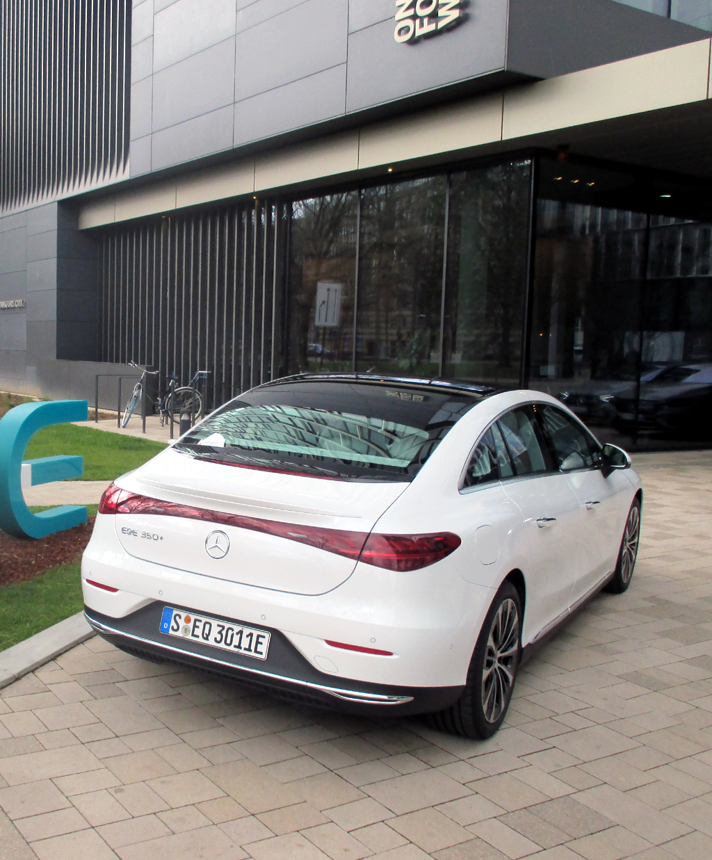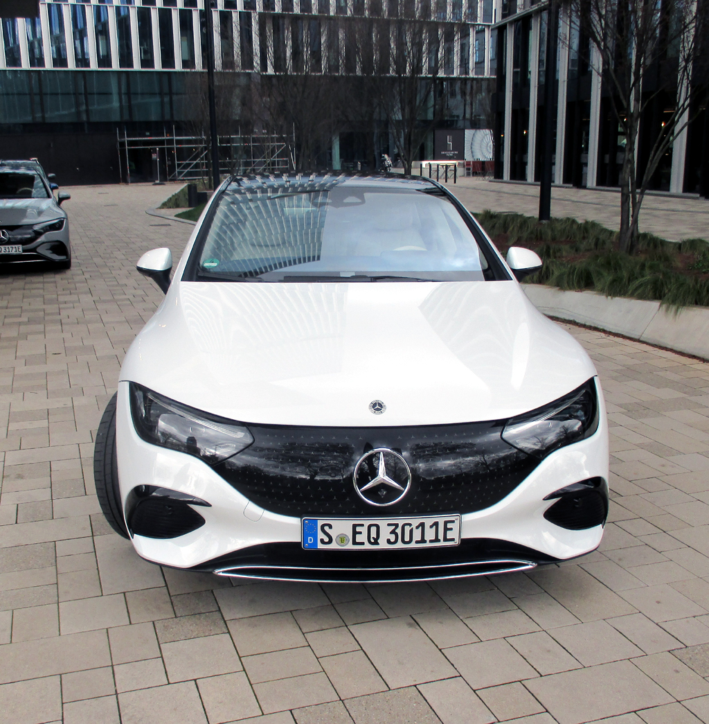 Das Auto: Die in Bremen für den Weltmarkt und in Peking für den chinesischen Markt gebaute Business-Limousine, sauber verarbeitet, wertig anmutend, 4,34 Meter lang, 1,96/2,10 Meter breit, 1,51 Meter hoch, Radstand 3,12 Meter, Kofferraum 430 Liter, ist nach dem Luxusliner EQS die zweite Modellreihe auf der Elektroplattform für große Fahrzeuge. Das insgesamt sogar ziemlich sportliche Design, von Mercedes Purpose genannt, englisch für „Zweck“, wartet mit kurzgehaltenen Überhängen und Vorbau, ausgeprägter Schulterpartie sowie einem Heck mit scharfer Abrisskante auf. Innen gibt es viel Platz für Passagiere. Selbst im Fond herrscht eine noch relativ großzügig-luftige Atmosphäre. Der weitgehend geräuscharme und vibrationslose EQE baut kompakter als der EQS, hat einen kürzeren Radstand. In den äußeren Dimensionen lässt er sich mit dem CLS vergleichen. Die Maße im Innenraum, wo ein spezielles System für besonders saubere Luft sorgt, übertreffen die E-Klasse. Design innen und Ausstattung lehnen sich an den größeren EQS an. Im modernen Digitalcockpit ist die Bedienung nach kurzer Eingewöhnung rasch im Griff. Der Hyperscreen, dessen drei unter einem Deckglas optisch verschmelzende Bildschirme sich schwungvoll quer fast von A-Säule zu A-Säule ziehen und das Reisen für Beifahrer abwechslungsreicher und unterhaltsamer machen sollen, ist Teil der Sonderausstattung.