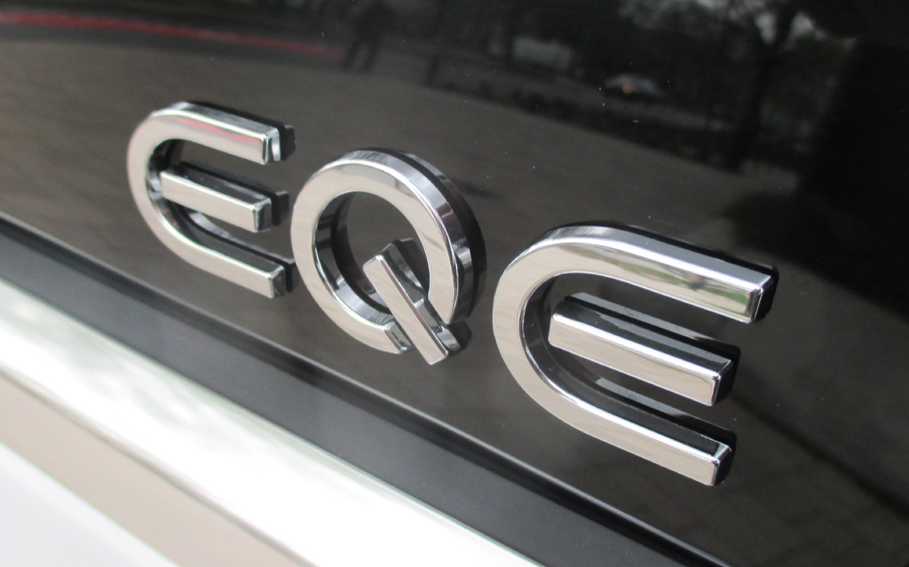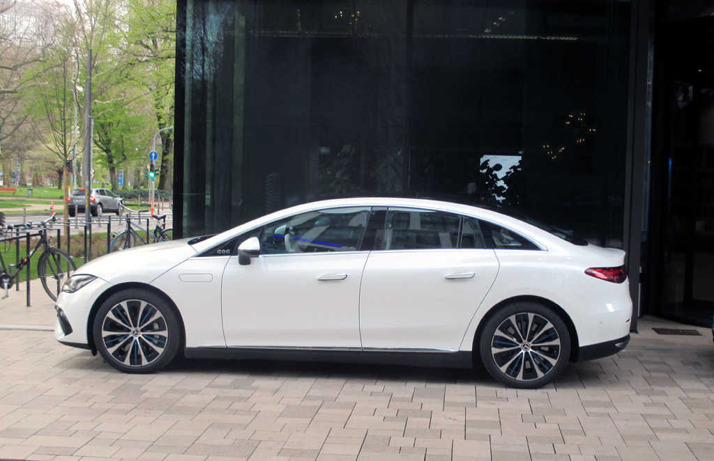 Heck-/Seitenansicht. Und so sieht die EQE-Limousine von der Seite aus.