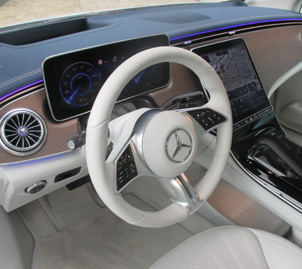 Das Fahren: Beim Tritt aufs Fahrpedal surrt der EQE fast ohne Geräusche überaus druckvoll voran. Das serienmäßige Komfortfahrwerk macht seinem Namen alle Ehre. Vielleicht nicht ganz so souverän wie der EQS, aber doch sehr gelassen ist man ebenfalls im kleineren Bruder unterwegs. Die Reichweiten scheinen reisetauglicher zu sein. Auf Wunsch kann die Fahrt sogar zum akustischen Ereignis werden. Die etwas künstlich wirkende Lenkung könnte noch etwas direkter Rückmeldung geben. Die auch mit für die Hinterachse für wendigeres und in Kurven agileres Unterwegssein ist genauso wie das Fahrwerk mit Luftfederung modellabhängig als aufpreispflichtige Option lieferbar. Die Scheibenbremsen packen standfest zu, falls nicht schon die Energierückgewinnung automatisch für genug Verzögerung sorgt. Sie wandelt im Schub- oder Bremsbetrieb mechanische Drehbewegung in elektrische Energie um, speist diese in den Akku ein; der Fahrer kann die Verzögerung in drei Stufen sowie die Segelfunktion über Schaltwippen hinter dem Lenkrad von Hand wählen. Praktisch bei der Navigation ist, dass sie auf Basis zahlreicher Faktoren die schnellste und komfortabelste Route samt Ladestopps plant und dynamisch etwa auf Staus oder Änderungen der Fahrweise reagiert. Das System visualisiert im Infotainment, ob die Batteriekapazität reicht, um ohne Laden zum Startpunkt zurückzukehren, bevorzugt bei der Berechnung manuell hinzugefügte Ladestationen entlang der Route, kann vorgeschlagene Ladestationen ausschließen und die voraussichtlichen Ladekosten pro Ladestopp berechnen.