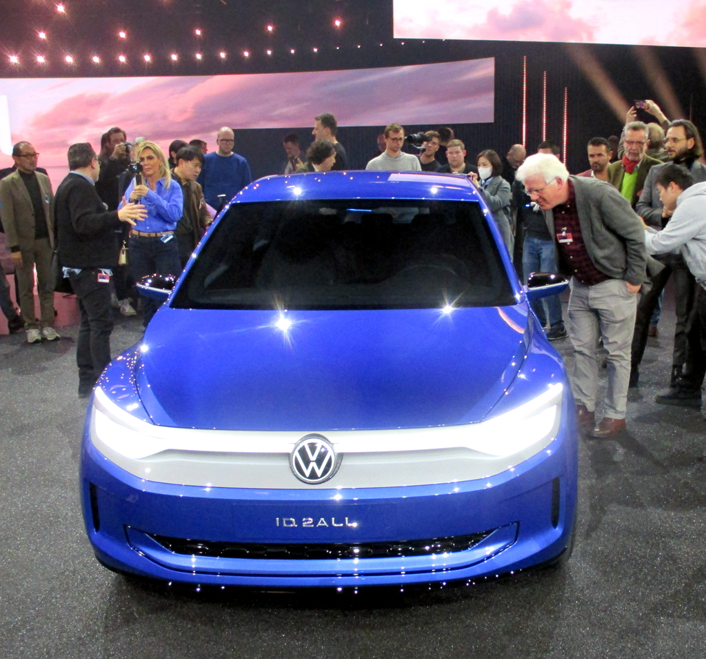 Der ID2all, englisch ausgesprochen „ID to all („ID für alle“), ist laut dem für die technische Entwicklung zuständigen Kai Grünitz das erste Fahrzeug mit Frontantrieb auf Basis des modularen Elektro-Konzernbaukastens. Mit der weiterentwickelten Plattform halte eine, so Grünitz, besonders effiziente Antriebs-, Batterie- und Ladetechnologie Einzug in den seriennahen ID („Geräumig wie ein Golf, preiswert wie ein Polo“), der über den Weg heller und weiter ausleuchtenden LED-Matrix-Scheinwerfer, dynamische Fernlichtregulierung, Reiseassistenz, Elektro-Routenplaner, 225er-Reifen auf 20-Zöllern und kompakte Abmessungen verfügt: 4,05 Meter lang. 1,81 Meter breit. 1,53 Meter hoch. Radstand 2,60 Meter. Kofferraum 490 bis 1330 Liter. Leistung 166/226 kW/PS. Unter sieben Sekunden aus dem Stand auf Tempo 100. 160 Stundenkilometer Spitze. Bis 450 Kilometer WLTP-Reichweite, bezogen wahrscheinlich auf die größere Batterie. Rund 20 Minuten Schnellladen für 10 bis 80 Prozent der Kapazität des Akkus.