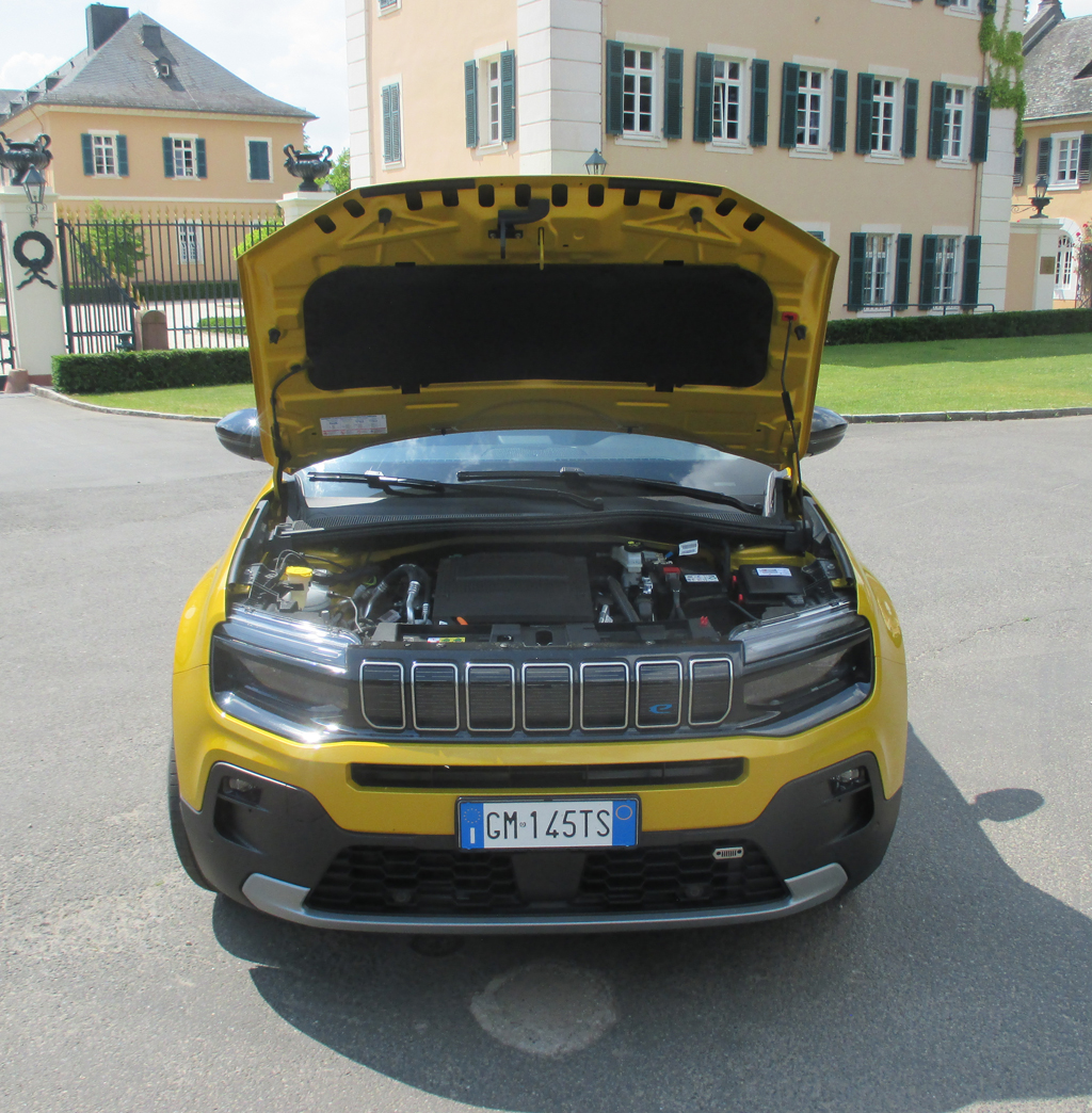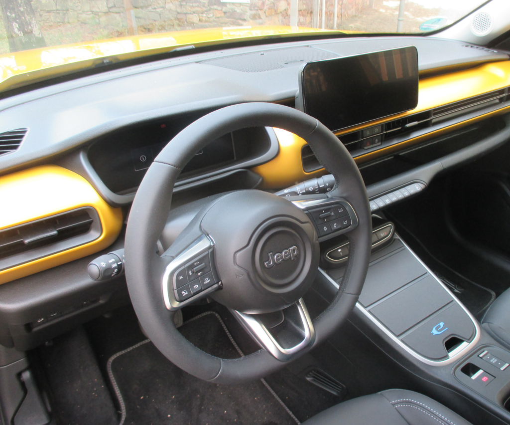 Der Antrieb: Der 400-Volt-Elektromotor aus dem Stellantis-Regal leistet 156 PS, stellt ordentliche 260 Newtonmeter Drehmoment zur Verfügung. Die Beschleunigung aus dem Stand auf Tempo 100 ist laut Datenblatt in 9,0 Sekunden geschafft, die höchste Geschwindigkeit bei 150 Stundenkilometern erreicht. Beim Antrieb handelt es sich um einen über die Vorderräder. Das Getriebe setzt sich aus einem Planetenradsatz zusammen. Mit der Batterie kommt Jeep auf brutto/netto 54/51 Kilowattstunden Kapazität. Die Ladezeit findet die sich je nach Anschluss und Kilowatt bei 24 Minuten von 20 auf 80 Prozent über 5 Stunden 34 Minuten bis 26 Stunden 41 Minuten in der Übersicht. Die elektrische Reichweite gibt Jeep kombiniert nach WLTP mit 389 bis 404 Kilometern an, für die Stadt mit bis zu 550. Der Verbrauch soll 15,3 bis 15,9 Kilowattstunden pro 100 Kilometern betragen, die wir bei unserer ersten Ausfahrt nur knapp verpasst haben.