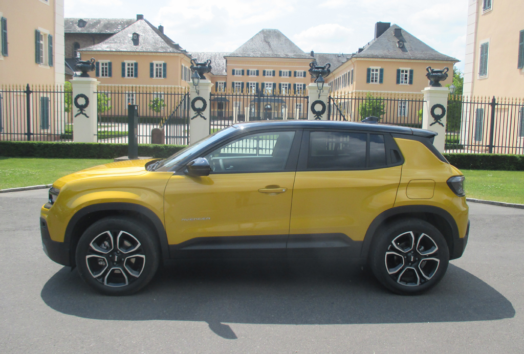 Das Auto: Noch unterhalb vom Renegade und Compass stellt der Avenger, englisch für „Rächer“, bei uns Jeeps Einstiegsmodell dar. Der in Europas zweitstärkster Klasse, dem B-SUV-Segment, positionierte fünftürige Fünfsitzer läuft in Polen solide verarbeitet und für seine Klasse standesgemäß anmutend vom Band, ist 4,08 Meter lang, ohne Außenspiegel 1,79 Meter breit und 1,53 Meter hoch, verfügt über 2,56 Meter Radstand und einen Kofferraum, der immerhin noch 355 Liter fasst. Leer bringt der kleine Vollstromer 1595 Kilo auf die Waage. Er kommt mit frischem Design, Sieben-Schlitz-Grill, kurzen Überhängen, ausladenden Kotflügel, trapezförmigen Radläufen, relativ großen Rädern, X-Rückleuchten, die an einen Militär-Benzinkanister erinnern, sowie klarem, robustem, vor allem vom Wrangler inspirierten Interieur daher.