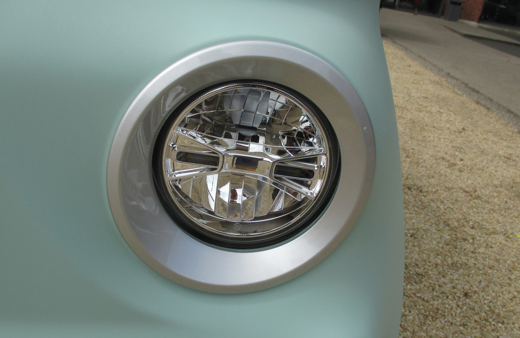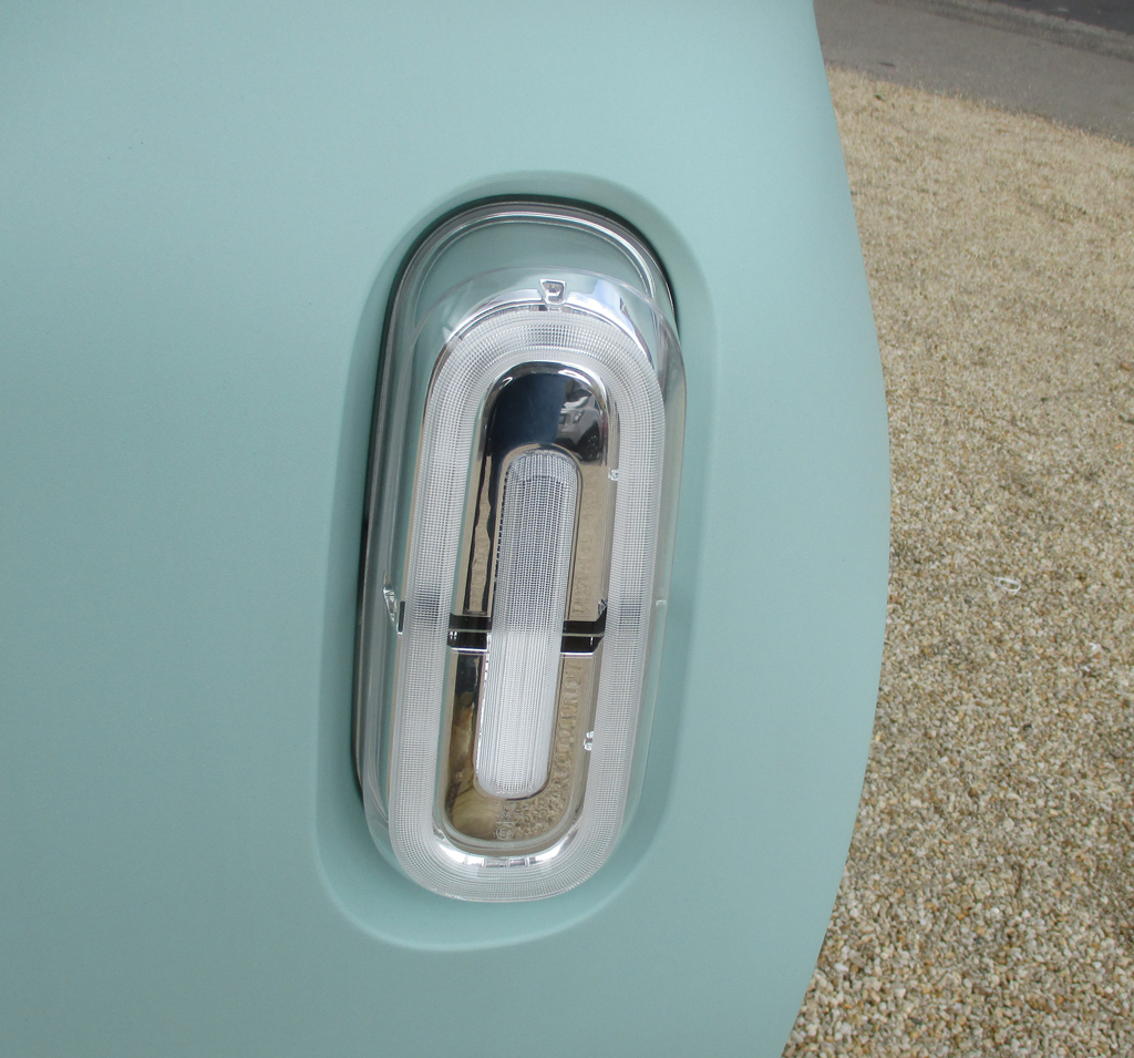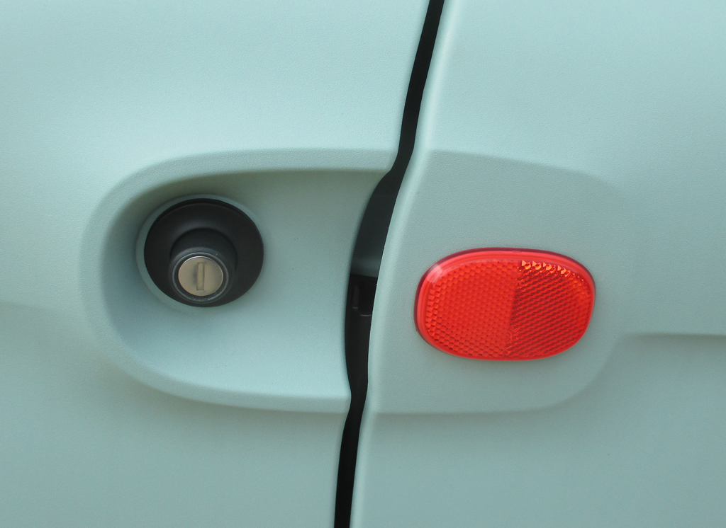 Vorn sind kleine Rundscheinwerfer verbaut. Per Druckknopf geht’s ins Innere.