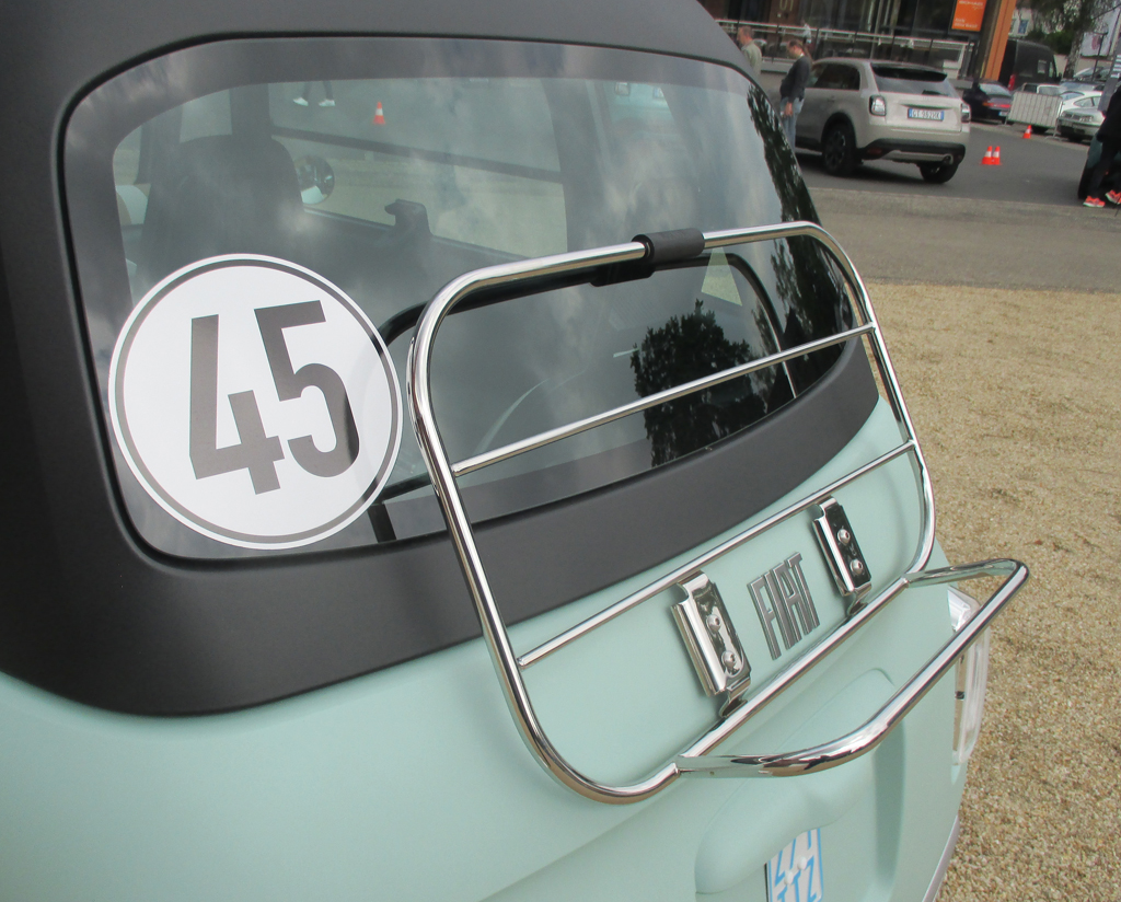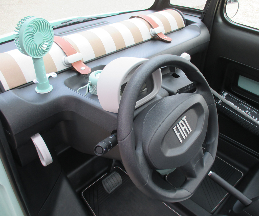 Leer bringt das Elektro-Leichtgewicht 410 Kilo auf die Waage. Beim 8,2-PS-Antrieb mit 44 Newtonmetern Drehmoment handelt es sich, kombiniert mit Ein-Gang-Automatik, um einen vollelektrischen mit – Nennwert – 5,4-Kilowattstunden-Batterie. 45 Stundenkilometer Höchstgeschwindigkeit genügen für den Stadtverkehr. Etwa zehn Sekunden dauert es, bis man auf diese Geschwindigkeit beschleunigt hat. Die Reichweite findet sich mit bis zu 75 Kilometern so zumindest im Datenblatt. Vorn sind Einzelradaufhängung und Scheibenbremsen vorhanden, hinten Verbundlenkerachse und Trommelbremsen. Ein regeneratives Bremssystem ist an Bord. Die elektrische Lenkung ist servounterstützt. Die drei Fahrprogramme heißen Drive (für Vorwärts), Neutral und Reverse (für Rückwärts). Die Ladezeit beträgt laut Fiat vier Stunden bei 2,3 Kilowatt Wechselstrom komplett von 0 auf 100 Prozent. Ein drei Meter langes Ladekabel ist fest in der Beifahrertür untergebracht. Wer will, kann optional einen Adapter zum Stromladen an öffentlichen Ladesäulen ordern.
