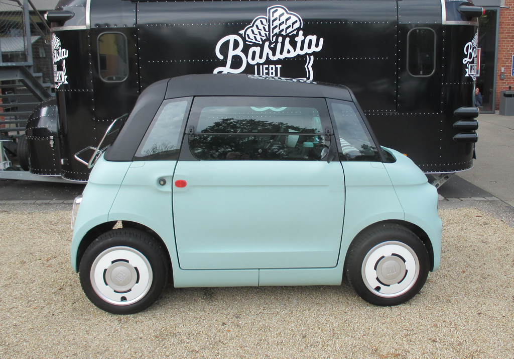 Die Beifahrertür schwingt nach vorn, die Fahrertür nach hinten auf; sie lassen sich nur mit Schlaufen schließen. Innen geht es mit viel Plastik schnörkellos-puristisch zu. Keine Klimaanlage, nur eine laute Lüftung. Das Cockpit bleibt aufs Wesentliche beschränkt. Infotainment gibt es nicht. Dafür ist ein kleines Schwarz-Weiß-Display mit Informationen etwa über Tempo und Ladezustand der Batterie da. Das Handy lässt sich mit dem USB-Port verbinden. Ein Bluetooth-Lautsprecher komplettiert die „rollende Party-Box“. Die versetzt nebeneinander angebrachten Sitze sind sparsam gepolstert, erhöhen die Beinfreiheit beim Beifahrer, ermöglichen zudem einen größeren Verstellbereich beim Fahrer. Ein Fach hinter den Sitzen hält weiteren Platz zum Beispiel für eine Sporttasche bereit. Die Kopffreiheit ist sehr gut. Für lichte und soweit recht angenehme Atmosphäre sorgt neben den größeren Fenstern das Serien-Panorama-Glasdach.