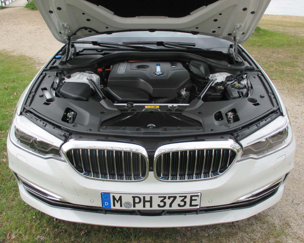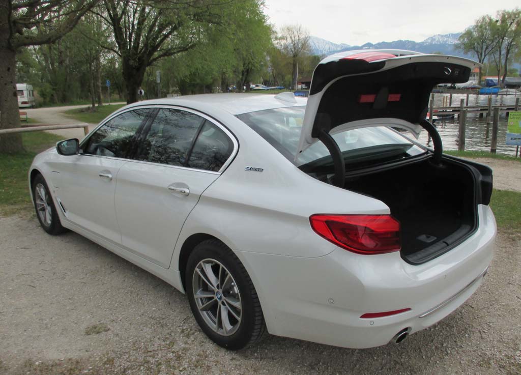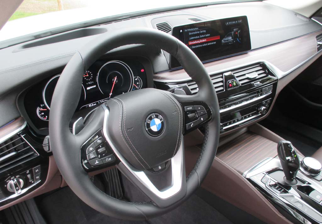 Das Fahren: Bei unserer flotteren Erstausfahrt meist über kurvige Landstraßen hat der Bordcomputer am Ende fast fünf Liter angezeigt. Die Spurtstärke beeindruckt. Dass sportlich-komfortable Unterwegssein im 5er ist bekannt. Einer oder beide Motoren leiten die Antriebsmomente auf die Hinterräder weiter. Wer rein elektrisch und damit wenigstens lokal vollkommen schadstofffrei fahren will, sollte nicht über 140 gehen, der Verbrenner schaltet sich sonst automatisch zu. Die elektrische Reichweite bleibt unter 50 Kilometern. Im ersten Fahrmodus arbeiten Verbrenner und Elektromotor bestmöglich zusammen. Im zweiten schaltet das System ganz auf Strom um. Im dritten lässt sich das Ladeniveau der Batterie einstellen, etwa um Energie für rein elektrisches Fahrten später aufzuheben. Je nach Anschluss sollen die Hochvoltspeicher in weniger als drei bis weniger als fünf Stunden nachladbar sein.
