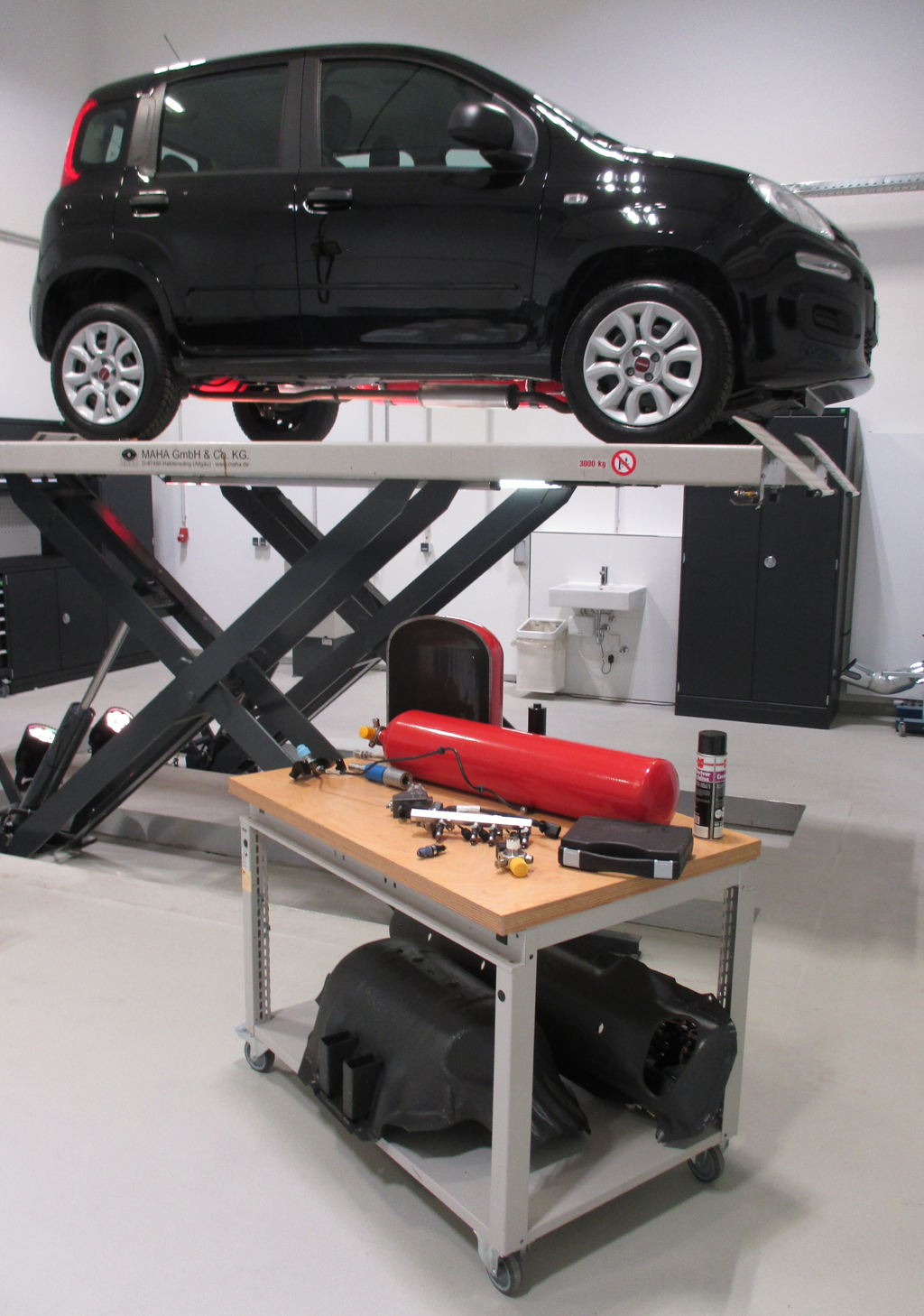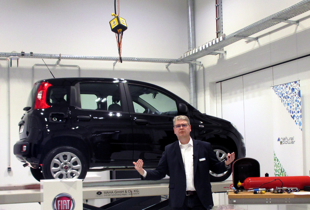 Fiat-Experte Kurt Pretscher erklärt die Technik vor dem Erdgas-Panda auf der Hebebühne. Foto: Koch