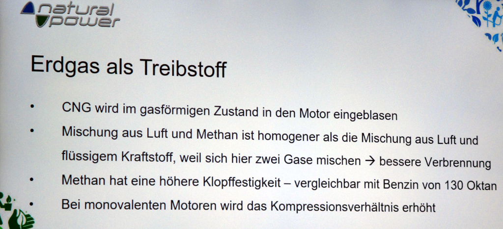 Die Vorteile von Erdgas, meist als CNG (für Compressed Natural Gas) angeboten, sind offensichtlich: Die Technologie scheint ausgereift. Die Kraftstoffkosten sind niedrig, die höheren zur Anschaffung amortisieren sich bald, die Umwelt wird weniger belastet. Biomethan mache Erdgas, chemisch Methan, zur „echten erneuerbaren Energiequelle“, findet Pretscher. Das Gas mit der hohen Oktanzahl ist in der Natur weit verbreitet, gelangt unterirdische dorthin, wo es gebraucht wird, „muss nicht transportiert werden“.