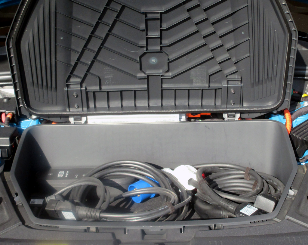 Blick auf die vier Markenringe vorn. Im Vorderwagen finden sich auch die Ladekabel.