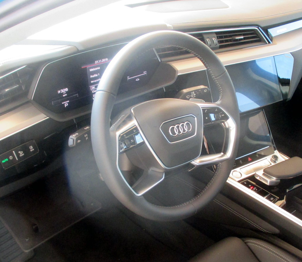 Die Ausstattung: Es gibt über der Basisausführung noch verschiedene Lines. S-Line ist sportlicher, Design Selection edler. Die Elektronikhilfen sind aus dem A6 und A8 bekannt. Auch der Komfort hat durchaus Oberklasse-Niveau, etwa von Individualkontursitzen auf Wunsch mit Massagefunktion über das Panorama-Glasdach, das mehr Licht durchs Innere fluten lässt, die Heckklappe, die sich elektrisch öffnet und schließt, und das Ambiente-Licht bis hin zum optionalen Paket für bessere Luftqualität, wahlweise mit Sommerduft „mit mediterraner Note, der an Meeresluft erinnert“, oder winterlicher „mit Piniennote, der frischer Bergluft nahekommt“. Wer will, kann auf klassische Außenspiegel verzichten, was die Aerodynamik verbessert und die Reichweite erhöht. Kameras projizieren noch etwas ungewohnt und nicht immer ganz blendfrei, das Geschehen neben und hinter dem Wagen virtuell auf Displays in den Türen. Der im Werk Brüssel Kohlendioxid-neutral produzierte e-tron läuft auf 19-Zoll-Leichtmetallrädern mit 225er-Reifen vom Band.