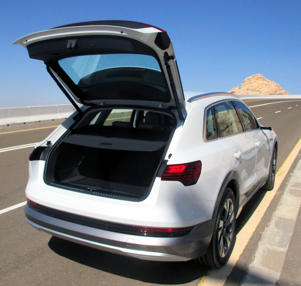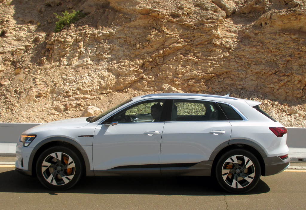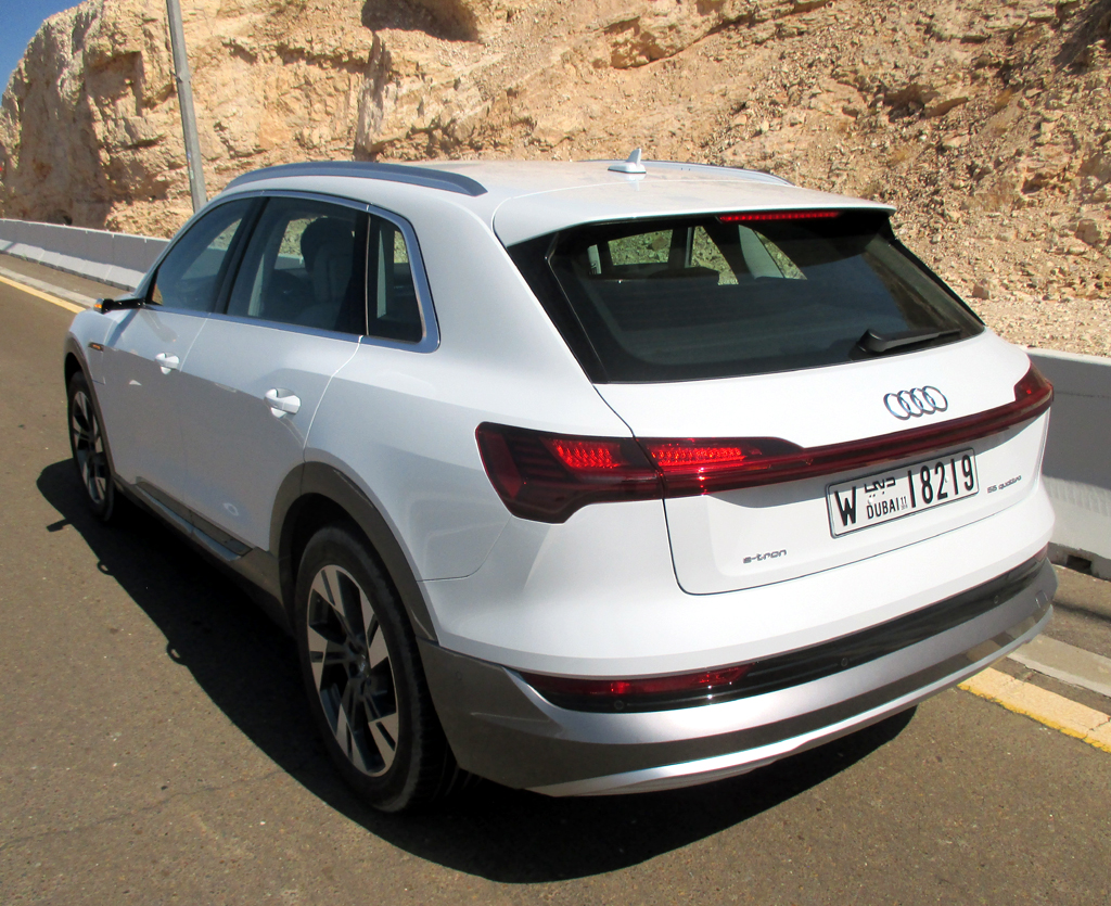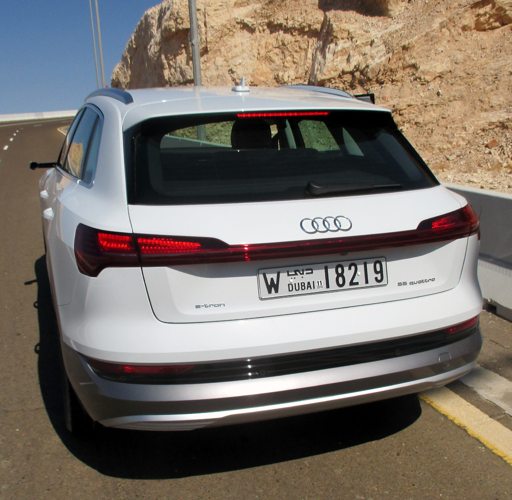 Das Fahren I: Die zwei Motoren schieben den leer wegen der Batterie doch 2490 Kilo schweren Stromer beim Tritt aufs Pedal zwar vehementer, aber nicht ganz so leichtfüßig voran, was man insbesondere in Kurven merkt. Der Audi zieht Lasten bis 1,8 Tonnen. Beim Durchqueren einer ebenen Wüstenpassage hat er gezeigt, dass man sich mit ihm zumindest in leichteres Gelände wagen kann, da der sonst sportlich und aus Gründen der Effizienz grundsätzlich heckbetonter ausgelegte Allrad permanent und vollvariabel die Antriebsmomente bestmöglich zwischen beiden Achsen verteilt. Das serienmäßige Fahrdynamiksystem passt die Charakteristik des Wagens den verschiedenen Terrains an. Gleich sieben Profile bis hin zu Offroad sind einstellbar.