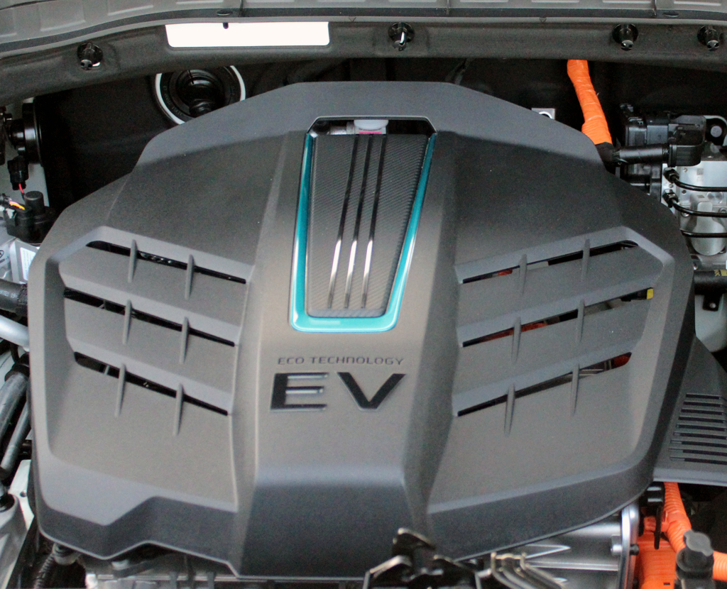 Schon die Front ohne Kühlergrill deutet auf Elektro hin. Blick auf das Markenlogo vorn.