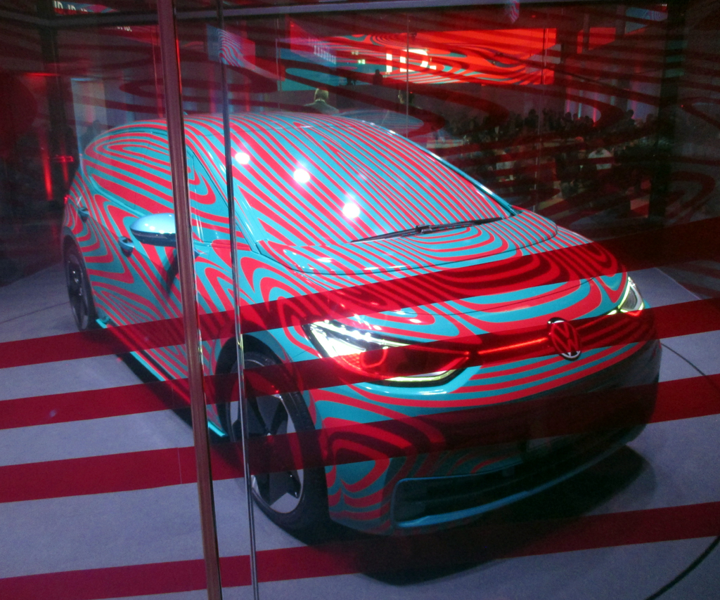 Noch hinter Glas und in Camouflage-Optik: ID3-Elektro-Kompaktmodell von VW. Foto: Koch