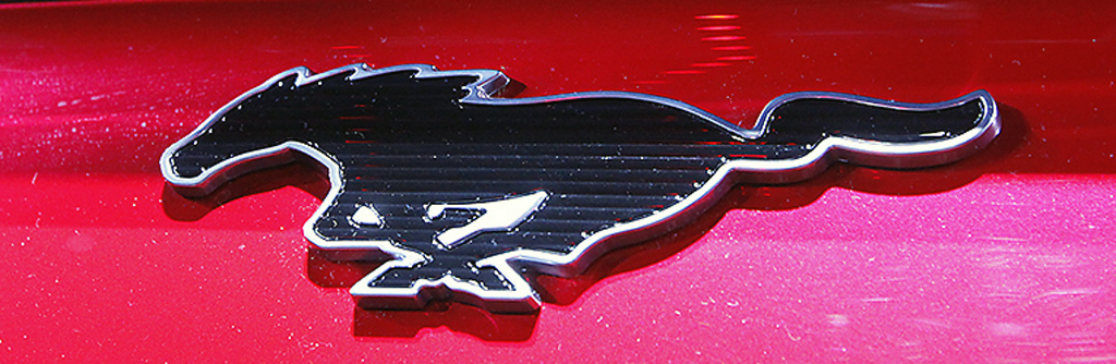 Blick auf die Frontpartie des Mach-E mit dem Markenlogo, dem wilden Mustang, vorn.