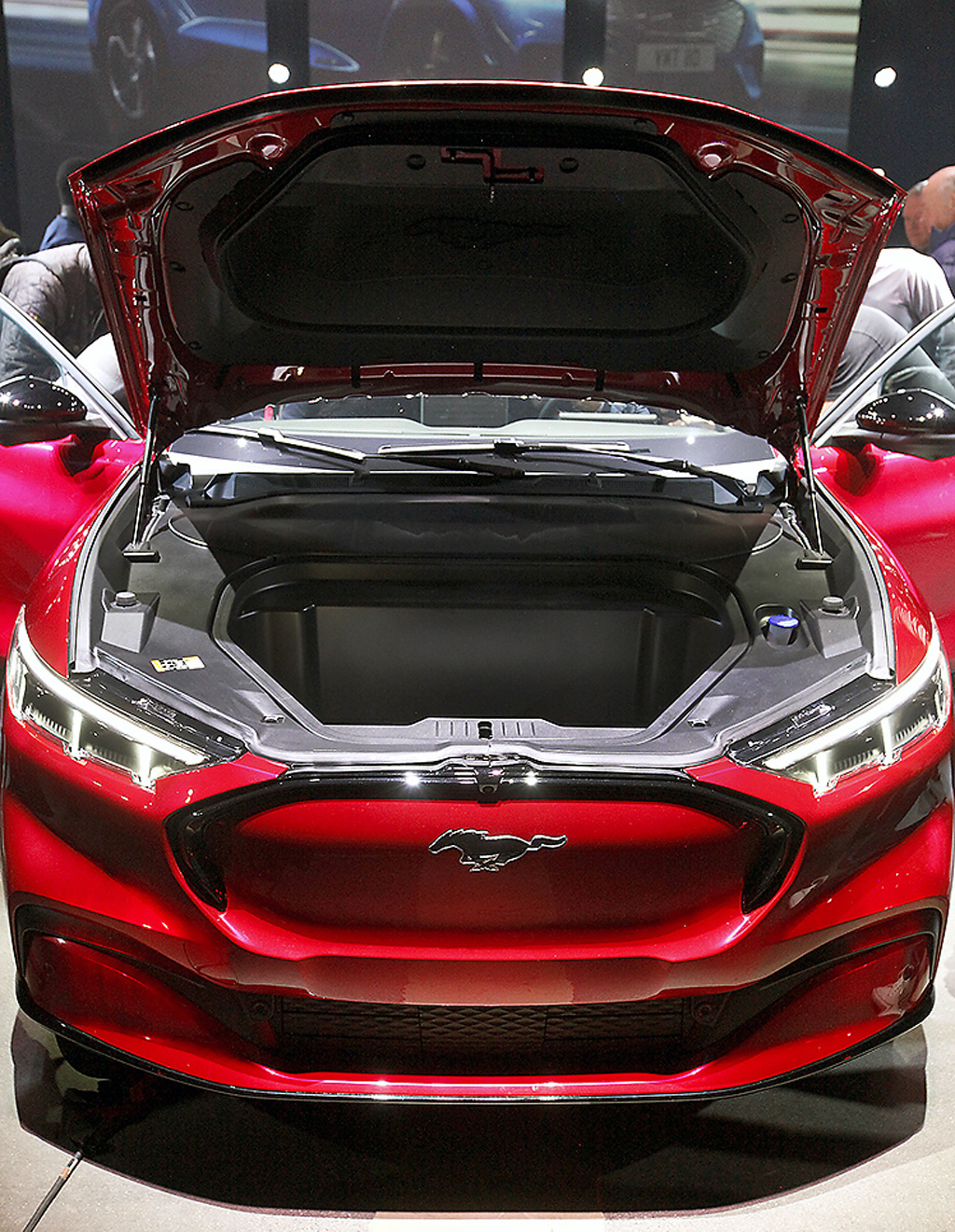 Das Auto: Die erste rein elektrische Variante der Marke im Crossover-Stil ist 4,71 Meter lang, 1,88 Meter breit, 1,60 Meter hoch. Die lange und kraftvoll gezeichnete Fronthaube sowie die Heckpartie mit den dreiteiligen Rückleuchten sind typisch für einen Mustang. Außer dem 100-Liter-Fach unter der Fronthaube finden sich im Gepäckabteil weitere 402, bei nach vorn geklappten Rücksitzen sogar bis zu 1420 Liter Ladevolumen. Innen haben sich die Entwickler um schlankes Design und viel Funktionalität bemüht. Die Lautsprecher des optionalen Soundsystems fügen sich nahtlos in den Armaturenträger ein, schweben wie eine Soundbar über den Luftausströmern. Das ebenfalls auf Wunsch lieferbare Panoramadach hält dank spezieller Glasbeschichtung infrarote und ultraviolette Strahlen fern, was im Sommer für einen kühleren, im Winter für einen wärmeren Fahrgastraum sorgt. Der Mach-E hat keine konventionellen Türgriffe mehr. Via Bluetooth erkennt er, dass sich das entsprechend legitimierte Mobilgerät des Fahrers nähert – und entriegelt die Türen. Selbst zum Starten ist es nicht nötig, das Smartphone oder einen Schlüssel in die Hand zu nehmen. Ist die Batterie des elektronischen Geräts leer, lässt sich dieser Mustang per Geheimzahl über ein Tastenfeld auf Höhe der B-Säule öffnen. Mit separatem PIN-Code, der auf dem zentralen Touchscreen eingegeben wird, ist der Wagen auch fahrbereit.