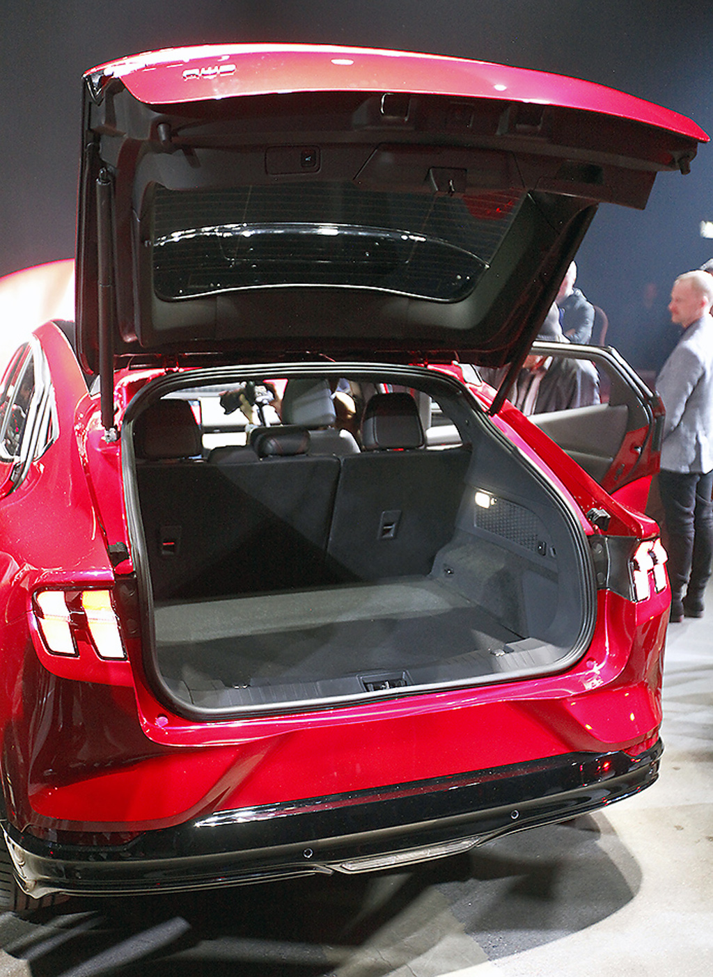 Das Fahren: Dass die Akkus platzsparend im Fahrzeugboden zwischen den Achsen angeordnet sind und der Schwerpunkt so tiefer liegt, wirkt sich positiv auf die Dynamik aus. Es gibt drei individuell anwählbare Fahrprogramme. Wird der Fahrmodus verändert, ändern sich automatisch etwa Ambientebeleuchtung, die Einstellungen des Infotainments und Antriebsgeräusch in Form authentisch komponierter Soundeffekte gleich mit. In Verbindung mit dem neu entwickelten Allrad soll das Fahrvergnügen ein „nochmals höheres Level“ erreichen, da das System die Drehmomentverteilung an Vorder- und Hinterachse vollkommen unabhängig voneinander regelt, was die Traktion erhöht, für agilere Beschleunigung sorgt und zusätzlich das Eigenlenkverhalten verbessert. Bei der sportlichen Bremsanlage haben sich die Entwickler bemüht, die Vorteile konventioneller Bremssättel mit den kompakten Abmessungen schwimmender zu vereinen. Der Mach-E kann eine Ladeleistung von bis zu 150 Kilowatt nutzen und damit die Ladezeiten deutlich senken. Für die heckgetriebene Variante mit größerer Batterie rechnet Ford vor, dass sie in zehn Minuten genug Energie für bis zu 93 weitere Kilometer tanken kann. Dem Modell mit Standardbatterie genügen demnach weniger als 40 Minuten, um den Stromvorrat von 10 auf 80 Prozent zu erhöhen.